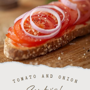 - Spread butter over your sourdough bread. Arrange tomato slices and onion slices as desired. Top with salt and pepper.
