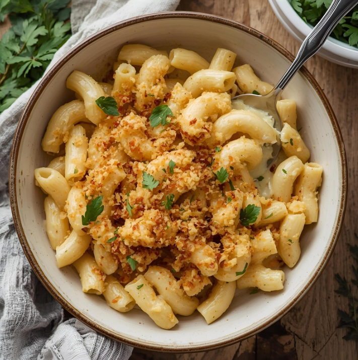 - Prepare the topping – Mix melted butter, bread crumbs, and parmesan cheese. Sprinkle the topping evenly over the macaroni.