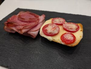 - Place top and bottom of sandwich into toaster oven and cook until the cheese has begun to melt and salami has just started to curl.